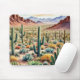 Eine lebendige Wüstenlandschaft mit einer Vielzahl von Kakteen und Wüstenflora, Set vor einem Hintergrund roter Felsgebirge und weit entfernten blauen Gipfeln