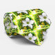 Diese lebhafte Krawatte kennzeichnet ein wiederholendes Muster einer weißen Blume des blühenden Tabaks mit sehr blassen malvenfarbenen Tönungen und einer hellgrünen Mitte. Eine zweite Knospe ist im Begriff sich zu öffnen. Beide sind Set gegen ein Feld der goldenen Calendulas und grünes Laub.