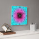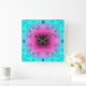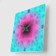 Digitales Kunstdesign in einem abstrakt symmetrischen Muster von hellblauen, rosa und lila Tönen, das dem Blick in den Mittelpunkt einer Blume ähnelt. Maßgeschneiderte blaue Zahlen in den Stunden 3, 6, 9, 12.