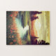 Ein Puzzle mit einer wunderschönen Wasserfarbenlandschaft von einem sonnigen Morgen und Blume am Flussufer.