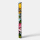 Dieses lebhafte Bild zeigt ein buntes Glasfenster mit mehreren stilisierten Blume. Zwei hellgelbe Blumen und ein sanftrosa dominieren die Szene, umgeben von grünen Blätter und wirbelnden Stielen, die alle mit dicken schwarzen Linien umrissen sind. Der Hintergrund ist eine strukturierte Mischung aus heller Blues und Weiß, die den farbigen Glaseffekt vervollständigt und die fröhliche Dynamik des Kunstwerks verstärkt.