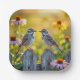 Auf einem rustikalen Holzzaun in einem sonnendurchfluteten Sommergarten mit Blume aus rosa Kegel steht ein Paar Spatzen.