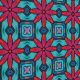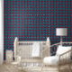 Diese geometrische Tapete zeichnet sich durch einen kleinen Druck von rot-magentafarbenen Blume auf einem blauen Hintergrund von Quadraten aus. Der Druck weist Details auf, die an Buntglas erinnern. Dieses Muster kann zwar an den Wänden verwendet werden, ist aber Teil einer Sammlung von Abziehbildern, die speziell für die Auskleidung von Schubladen, die Rückseite von Regalen und andere Möbelflächen hergestellt wurden.