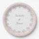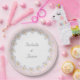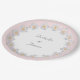 Weiße Plumeria-Blume auf hellrosa und weißen Tellern aus Party. Text kann personalisiert für Hochzeitstag, Geburtstag und mehr..