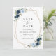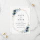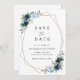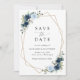 Mit dieser bezaubernden Save the Date Karte laden Sie Freunde und Familie in Stil und Set ein. Das Design umfasst marineblau-blaue Aquarellfarben, Blume im Grünen und goldene Rahmen auf weißem Hintergrund.