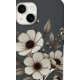 Ein Blume-Bouquet mit großen, weißen Blüten und dunklen Zentren, umgeben von verschiedenen Blätter und kleinen Blumenelementen. Die Illustration erfolgt in einem monochromatisch-braunen Kunststil, wobei die komplizierten Details der Blätter und des Blattwerks auf einem schlichten Hintergrund hervorgehoben werden.