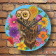 Eule in einem Blumenstrauß mit bunten Blume in blauer Umgebung