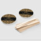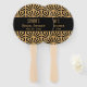 Deko Fan Blume motif Brautparty Handventilator aus Gold und Schwarz. Das Design weist ein sich wiederholendes Lüftermuster in Gold und Schwarz auf und in der Mitte befindet sich ein schwarzes Band mit dem eigenen Blume. Motiv im Gatsby-Stil der 20er Jahre.