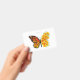 Orangefarbener, detaillierter Monarchen-Schmetterling mit einem Flügel mit gelbem, lebendigen kalifornischen Mohn auf weißem Hintergrund.