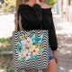 Blume & Butterfly Black & White Stripes überdruckt Totbeutel. Der Hintergrund mit gewölbten Streifen sieht aus wie das Meer oder eine kurvige Zickzackfigur oder Zickzack Kunst.