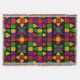Diese Wurfdecke hat ein Schwarzes Geschichtsbild von Blume und Reihen aus Dreiecken und Rechtecken.