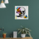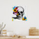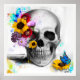 Original digitale Malerei. Realistischer menschlicher Schädel in grauem Maßstab, farbenfrohe wilde Blume und Schmetterlinge, die aus der Augenhöhle wachsen. Aquarellfarbe Spritzer. Gelbe Sonnenblumen, rosa und lila Gänseblumen und rote Mohnblumen. Modernes Design des Zuckerschädels. Ideal zu Halloween oder für diejenigen, die einen Hauch von Gotik Liebe.