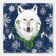 Ein weißer arktischer Wolf mit schneebedeckten Blume, gezeichnet im Jugendstil. Eine dunkelblaue Kulisse und Schneeflocken hinter und um den arktischen Wolf.