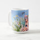 Diese Tasse ist eine schöne Fee in einem rosa Kleid mit einer Krone aus rosa Blume. Sie sitzt in einem Feld von Blume unter einem klaren, blauen Himmel.