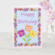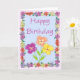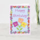 Eine hübsche Geburtstagskarte mit handgezeichneten bunten Blume auf rosa Untergrund und einem Blumenrahmen.