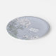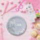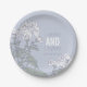 Blumenweiße Chrysanthemumgrafik zeichnend auf grauen Hochzeitspapier-Tellern. Moderne Hochzeit im Herbst Blume Design Teil des Chrysanthemum Weiß Hochzeitsstipps Set. Hübsche Pastelltöne in Grau, Weiß und Grün auf einem hellgrauen Teller. Bearbeiten Sie diese Hochzeitspapier-Teller mit Ihrem eigenen Brautennamen und Ihren eigenen Hochzeitsdaten. Einfache, aber elegante Teller eine große personalisierte Ergänzung zu Ihren Hochzeitstischen. Ideal für eine Hochzeit im Herbst im Spätsommer oder im Frühherbst, oder für eine Hochzeit mit weißem und grauem Thema, Verlobung oder Jubiläum. Einzigartiges zeichn und Design von Sarah Trett. www.sarahtrett.com für www.mylittleedenweddings.com