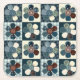 Das niedliche Ländermuster weist eine vierteilige Wiederholungsgrafik von Blume mit Patchwork-Schaltflächen in Blautönen mit komplementären Farben auf.