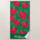 Das ist ein personalisiertes Badetuch, das mit schönen Blume aus rotem Hibiskus auf den tropischen Palmen Blätter besticht. Sie können den Namen des Designs ändern, indem Sie die Schaltfläche Personalisieren verwenden