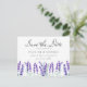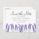 Datum freihalten! Mit dieser eleganten, blumengeschmückten, Save the Date Postkarte verkünden Sie Ihren Hochzeitstag. Es zeigt Aquarellbilder für Lavendelsträuße und skurrile Blume. Personalisieren Sie diese durch Hinzufügen von Namen, Datum, Ort und anderen Details. Lila, florale Save the Date Postkarte ist ideal für Frühling und Hochzeiten im Herbst.