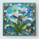 Eine lebendige Darstellung weißer Lilien, umgeben von aufwändigen Blumenmustern mit blauem Hintergrund.