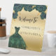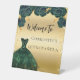 Ein Willkommenszeichen für eine Quinceañera, 15. Geburtstagsfeier. Ein Imitat goldener Hintergrund mit Imitaten goldenen Glitzer Glitzern, ein smaragdgrünes Kleid und Rose, Blumenmuster. Personalisieren und einen Namen hinzufügen.