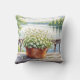 Hübsches Kissen mit einer wunderschönen Abbildung von weißen Blume in einem Kupfertopf mit Rückblick auf einen ruhigen See mit Kiefernbäumen.