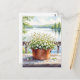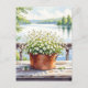 Hübsche Postkarte mit einer wunderschönen Abbildung weißer Blume in einem Kupfertopf mit Rückansicht eines ruhigen Sees mit Kiefernbäumen. Behalt in Touch mit einem Freund oder Familienmitglied mit dieser schönen Postkarte.