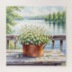 Hübsches Puzzle mit einer schönen Abbildung von weißen Blume in einem Kupfertopf mit einem Rückblick auf einen ruhigen See mit Kiefernbäumen.