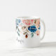 Eine Tasse mit hübschen, rosa und blauen Rose und grünen Blätter. Set auf hellgelbem Hintergrund.