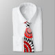 Diese Krawatte hat ein Muster von Ringen und Kreisen in Rottönen, die durch schwarze Linien überquert werden und Blume auf einem weißen Feld bilden.