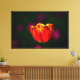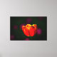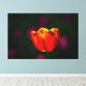 Rote Tulpe-Blume vor dunkelgrünem Hintergrund und rosa, verschwommene Flecken anderer Tulpe-Blume. Boul des Feuers, Kugel des Live-Sonnenlichts. Das Symbol des neuen Lebens. Shine, beleuchten, bestrahlen und inspirier!
