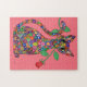 Diese niedliche, lustige, skurrile Folklorekunst zeichne mit einer farbenfrohen, fast psychedelischen Mosaikkatze, die mit farbigen, geometrischen, hochdetaillierten Millefiori- oder Muranoglas-Blume bedeckt ist, die denen aus Muranoglas ähneln. Diese einzigartige Fantasiekitty sitzt vor einem rosa Hintergrund und hält eine Single-rote Rose im Mund. Dieses einzigartige Puzzle ist perfekt für Kinder, Jugendliche, Jugendliche und Jugendliche jeden Alters.