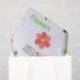 Rosa Blume und Rose mit Text auf grauem Hintergrund.