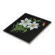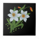Schönes Bouquet mit bunten Frühlingsblumen, gelben Tulpen und weißen Narzissen auf schwarzem Hintergrund.