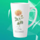 Blume November Chrysanthemum Latte Tasse mit einer Abbildung einer Chrysanthemum Blume. Unter der Blume wird der Name in einem eleganten Script-Schriftart geschrieben. Unter dem Namen wird "November - Chrysanthemum" Staaten, was darauf hinweist, dass der Geburtsmonat des Besitzers im November ist und ihre Blume das Chrysanthemum ist. Es ist ein personalisierter Schlamm, der als nachdenkliches Geschenk für jemanden, der im November geboren ist, angepasst wurde.