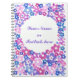 Ein sehr hübsches Spiralheft, das Sie persönlich gestalten können. Es ist mit einem blumengeschmückten, rosa, blauen und lila Blumenmuster aus einer handbemalten Papiercollage von Judy Adamson gestaltet. Andere Produkte mit diesem Design sind in meinem Shop erhältlich.