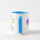 Eine schicke, weiße Kaffeemaschine mit blauer Lippe und Griff, mit Blumenmotiv dekoriert, aus einer handbemalten Papiertüte von Judy Adamson.