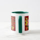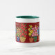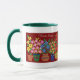 Eine Ringer-Tasse mit grüner Lippe und Handgriff und einer Reihe bunter Blume, von einer handbemalten Papiercollage von Judy Adamson. Anpassbar.