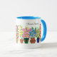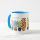 Eine weiße Ringer-Tasse mit pulvlerblauer Lippe und Haltegriff und einer Reihe bunter Blume, von einer handbemalten Papiercollage von Judy Adamson. Anpassbar.