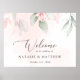 Fügen Sie Ihrer Hochzeitsfeier eine persönliche Touch mit diesen stilvollen und unvergesslichen Party hinzu! Die Einrichtung besteht aus rosafarbenen Blume und Grün auf einem hellrosa Hintergrund.