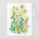 Eine Postkarte mit einem Blumenstrauß mit Frühlingsfarbe und Aquarellfarbe, einschließlich Nigella, Viola und Primrose. Die Wildblumen sind mit einer Kachelfarbe versehen.