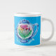 In einem Teekessel-Design finden Sie farbenfrohe Blume. Die lebhaften Farbtöne Rosa, Gelb und Grün heben sich ab und bilden einen bemerkenswerten Kontrast zum blauen Teekessel.