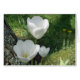 Tulips sind eine ständige Pflanze der Gattung Tulipa und gehört zur Familie Liliaceae. Die Tulpe blüht Jahr für Jahr, mit den blühenden Frühlingsblumen in Ihrer Gartenlandschaft. Drei weiße Tulpenblüten stehen auf langen grünen Stielen hoch, während die weißen Blätter den Vordergrund dominieren. Ein blaugrüner Lichen klammert sich an der Rinde eines Kiefernbaums. Der Baum wirft einen Schatten über den Rasen. Verschiedene Tulip-Blätter sind in Pastellgrün oder hellgrün dargestellt.
