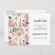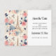 Hochzeit (oder andere) Save the Date Postkarte mit französischem Motivbild. Hübsche Blume, Eiffelturm und Schmetterlinge. Die Farben sind pink, blau, pfirsichfarben und creme.