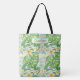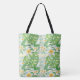 Eine reizende tropische Tote-Tasche bietet Aquarellbilder von weißen Frangipani-Blume mit großen Monstera-Blätter auf hellblau und gelb gestreiftem Hintergrund.