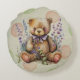 Brauner Teddybär mit lila Bogen, sitzend in Lavendel-Blume mit Vintag rosa und grünem Punkt Hintergrund.