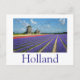 Postkarte mit lila und rosa Hyazinthen-Blume und drei Windmühlen in einer Landschaft in der Bulb Region in den Niederlanden mit weißer Grenze und Testkiste: Holland.