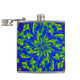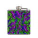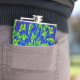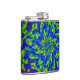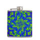 Dieser farbenfrohe angesagte Kolben weist ein abstraktes, kreisförmiges, blumengeschmücktes Mandala-Muster aus leuchtenden Grüntönen und Blues auf, das um eine zentrale Blume wirbelt. Lila und magentafarbene Wirbel sind auf der Rückseite.