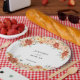 Elegante Teller aus Blumenpapier mit Aquarellfarben-Blume in Orange-, Rot-, Gelb-, Pfirsich- und Grüntönen.Fügen Sie Ihrem Hochzeitsempfang eine einzigartige und unvergessliche Touch hinzu.