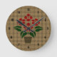 Reizende rote Blumen mit grünem Blätter in einem braunen Topf auf einer tan Korbwebart. Webart ist computererzeugt und Fake, aber sie schaut auf Material cool!